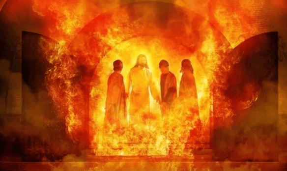 It certainly reminds me of the story in Daniel of the 3 men who are thrown into a fiery furnace in Babylon because they would not worship an idol.